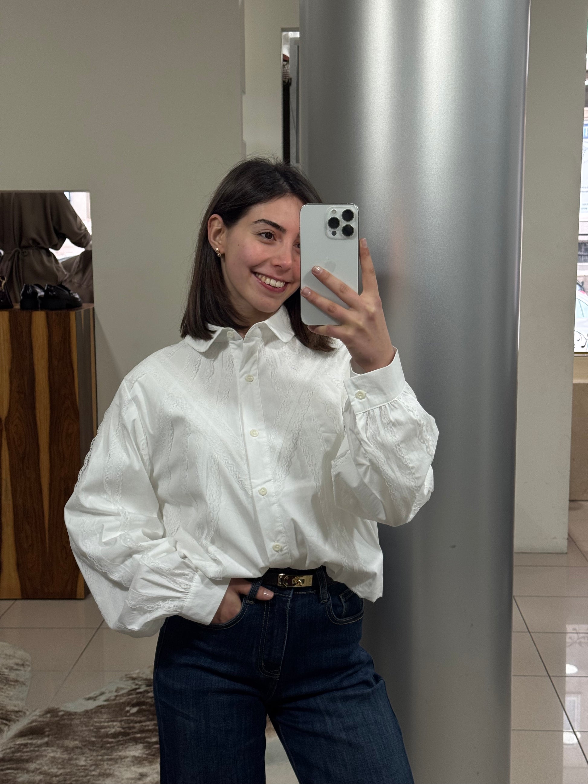 Confeccionada em 100% algodão, esta camisa fluida destaca-se pelos elegantes pormenores em renda, que acrescentam sofisticação e delicadeza à peça. As mangas de balão completam o design com um toque romântico e contemporâneo.