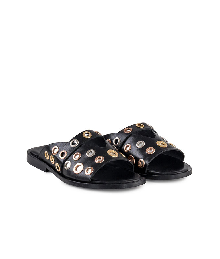 Sandálias rasas confeccionadas totalmente em pele preta, com detalhe original de ilhós em vários tamanhos e cores que acrescentam um toque arrojado e contemporâneo. O design combina conforto, qualidade e estilo irreverente — perfeitas para dar personalidade ao teu look de verão.